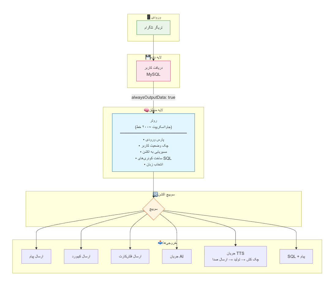 [تلگرام] → [دریافت کاربر] → [روتر JS] → [سوییچ] → [خروجیهای مختلف]